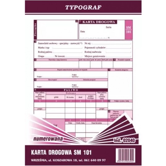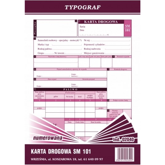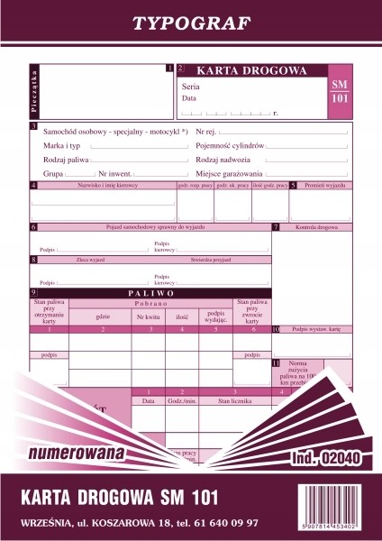 Druk karta drogowa na samochody osobowe sm 101 numerowana A5