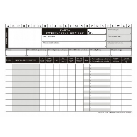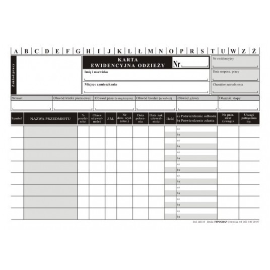 Druk ewidencja odzieży A5 50 sztuk Typograf