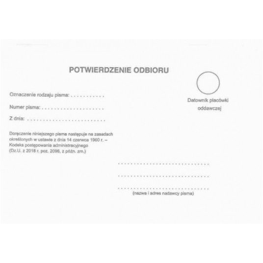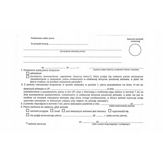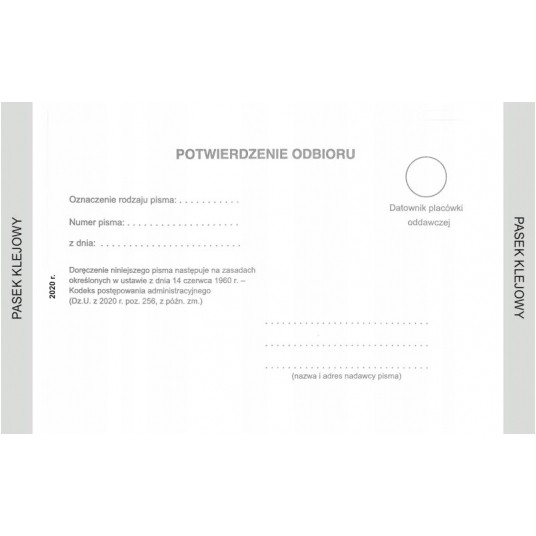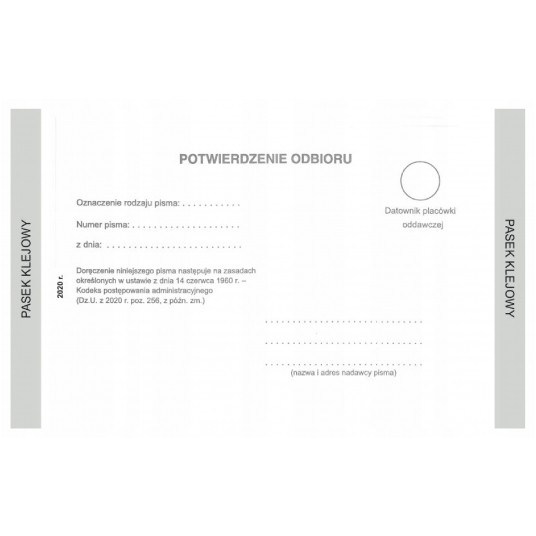 Druk zwrotne potwierdzenie odbioru pisma, kodeks postępowania administracyjnego samoprzylepne, 100 sztuk